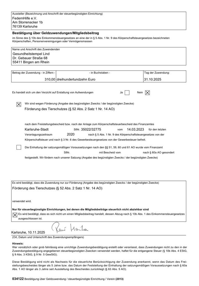 ich die Gelder an "Federnhilfe.ev." weiter.