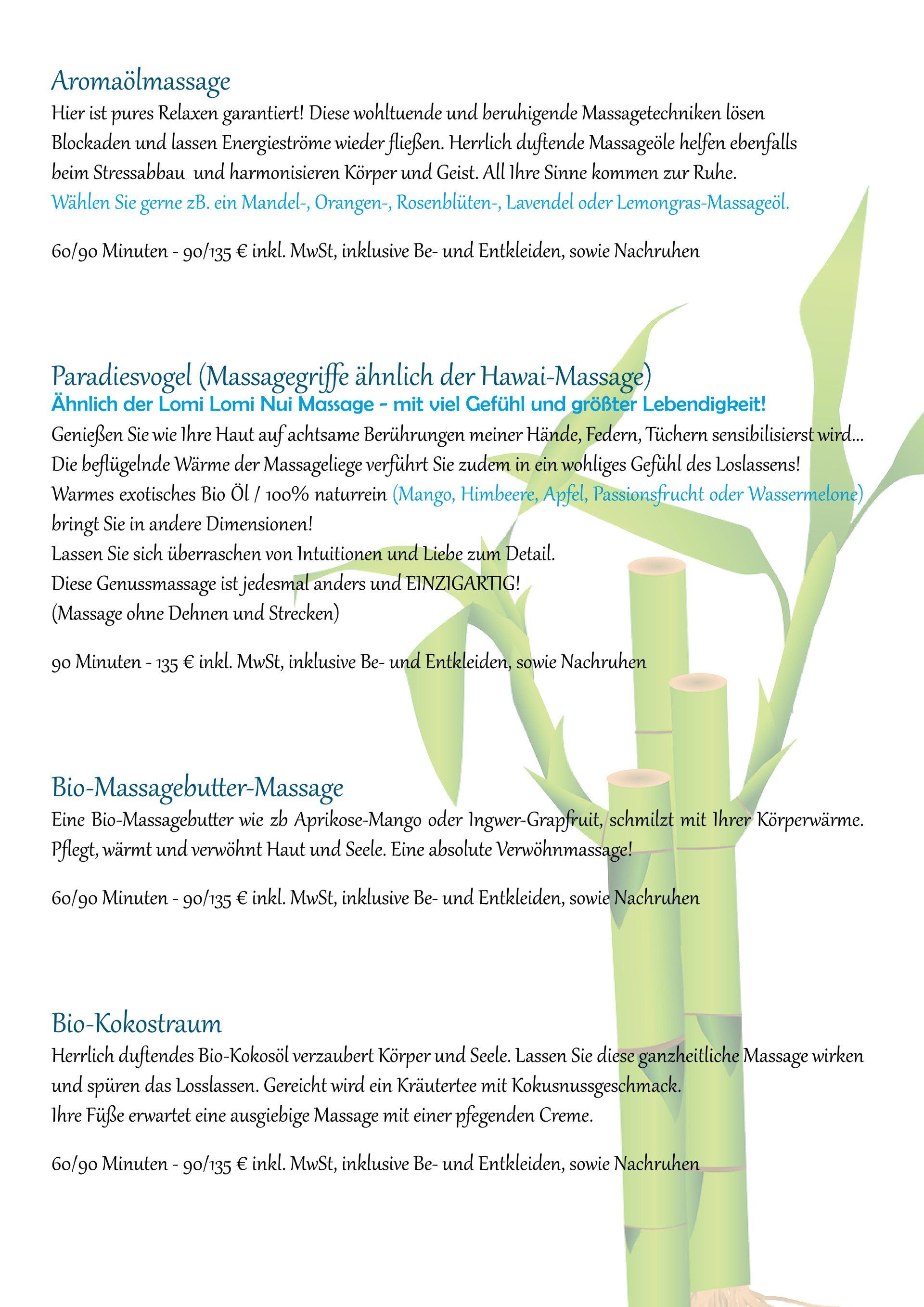 Ich biete zwei sehr stilvoll und mit Kerzen, Düften gemütlich eingerichteten Massageräume an. In der „grünen Oase“ steht eine Massagebank zur Verfügung und in der „Indian Chillout Lounge" eine Futonliege. Sollten Sie gesundheitlich eingeschränkt sein empfehle ich für die Wohlfühlzeit gerne die flache Futonliege.
